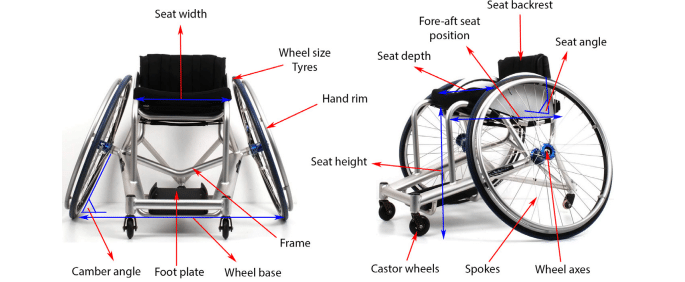 Ten eerste is dat het zitje zelf. Behalve dat de afmetingen samenhangen met de fysieke bouw van degene die erin plaatsneemt, draagt de pasvorm bij aan een goede steun tijdens het slaan. Dit geldt ook voor de stand van het zitje ten opzichte van de wielen en de positie van de voeten ten opzichte van het lichaamszwaartepunt. Al eerder werd geconcludeerd dat een juiste zithoogte van belang is voor de wendbaarheid van een rolstoelatleet.