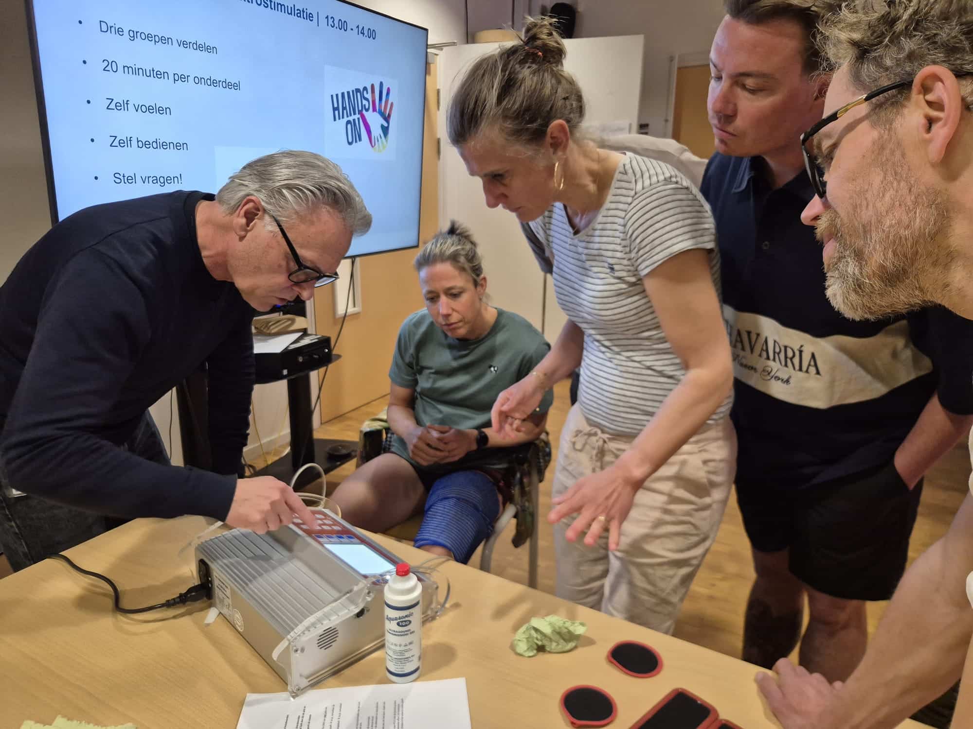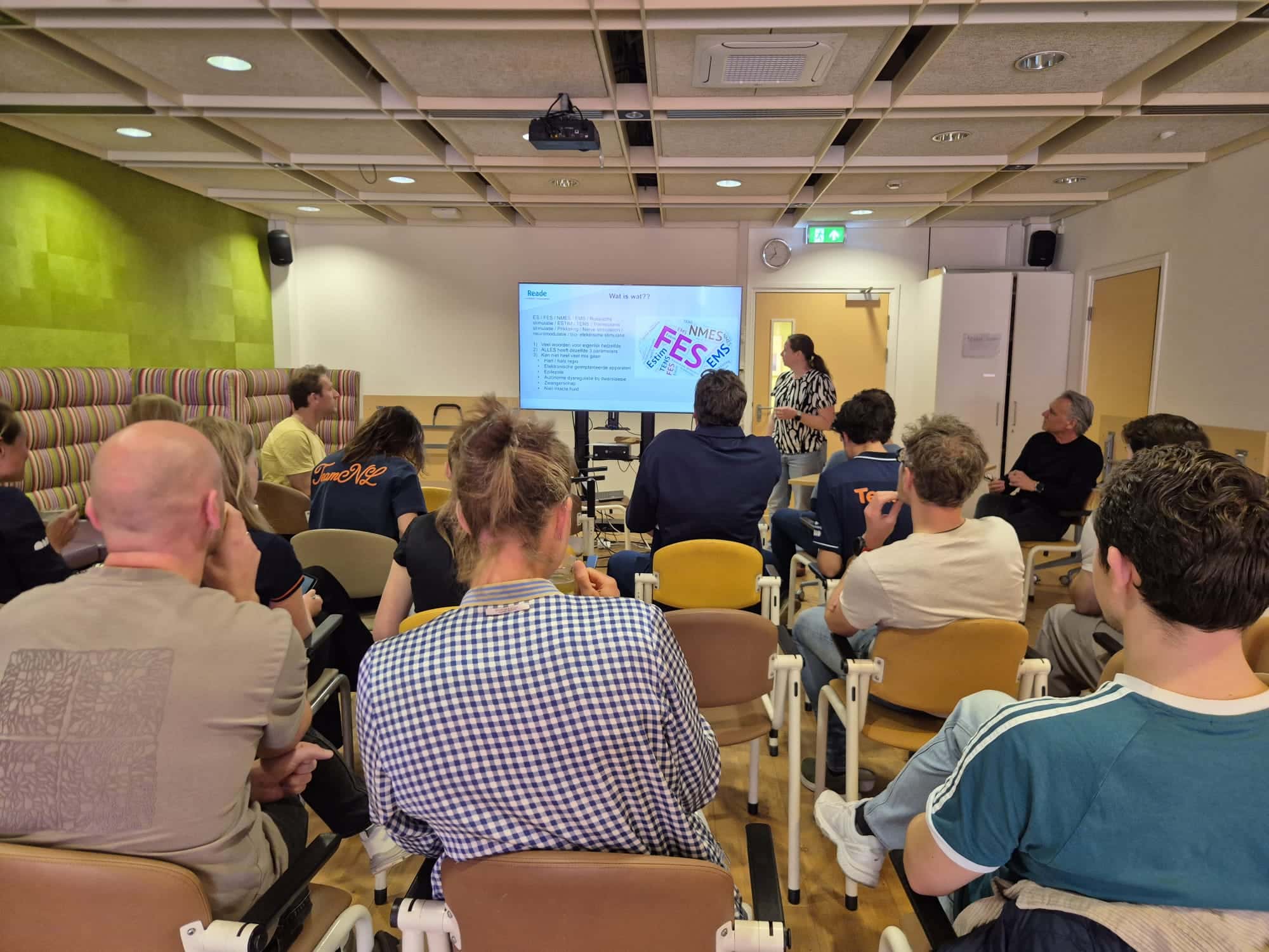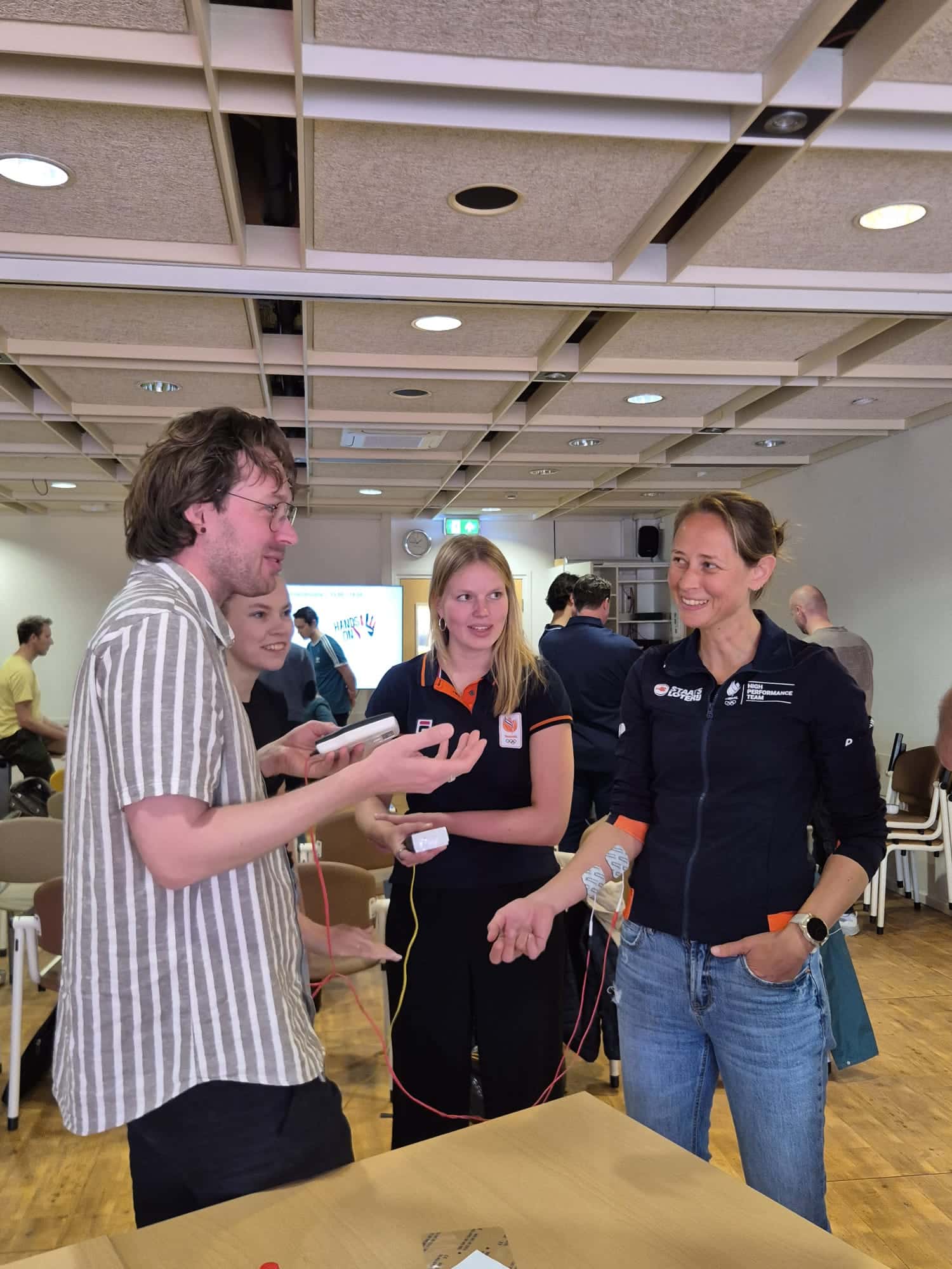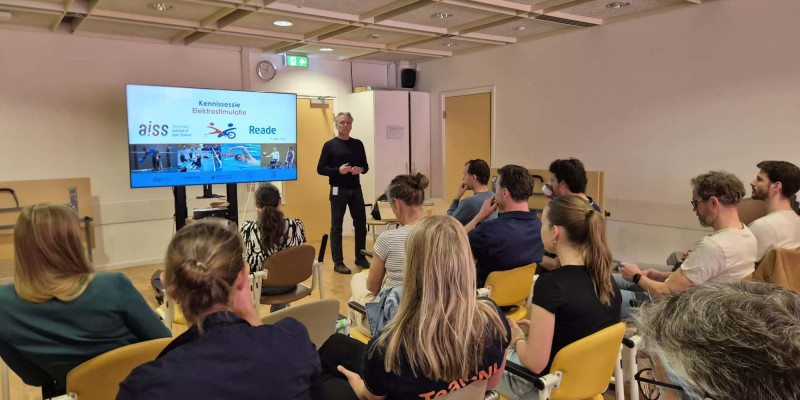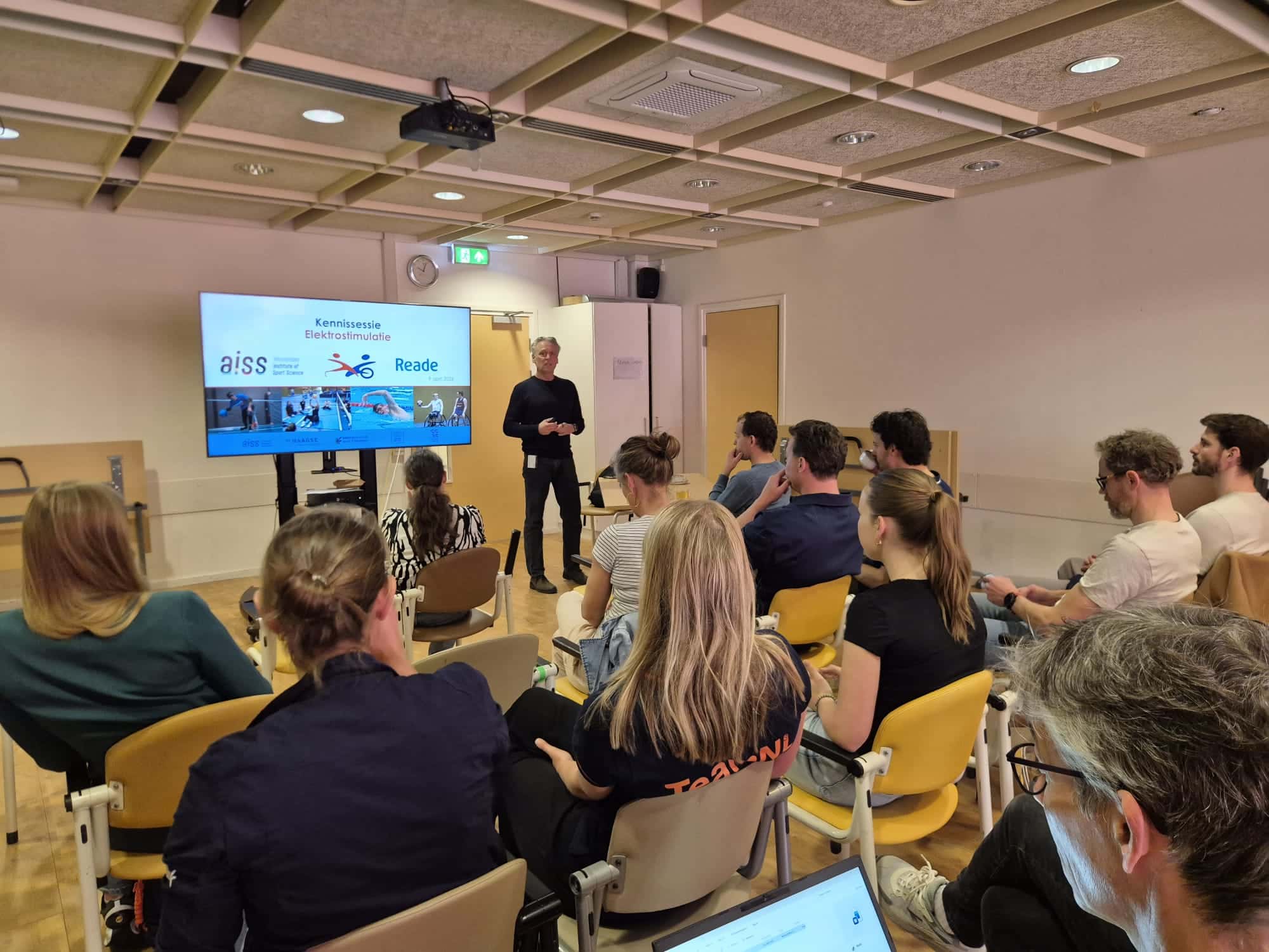Naast coaches, trainers en embedded scientists namen ook veel fysiotherapeuten deel aan de bijeenkomst. Eerst gaf Thomas Janssen een theoretische onderbouwing van de (veelal) gunstige fysiologische effecten van elektrostimulatie. Daarna volgde een praktische uitleg over de beschikbare apparatuur door Suzanne Romviel. Inclusief een workshop door Janssen, Romviel en Boas Wijker, waarbij de deelnemers aan den lijve konden ervaren hoe elektrostimulatie werkt en voelt.