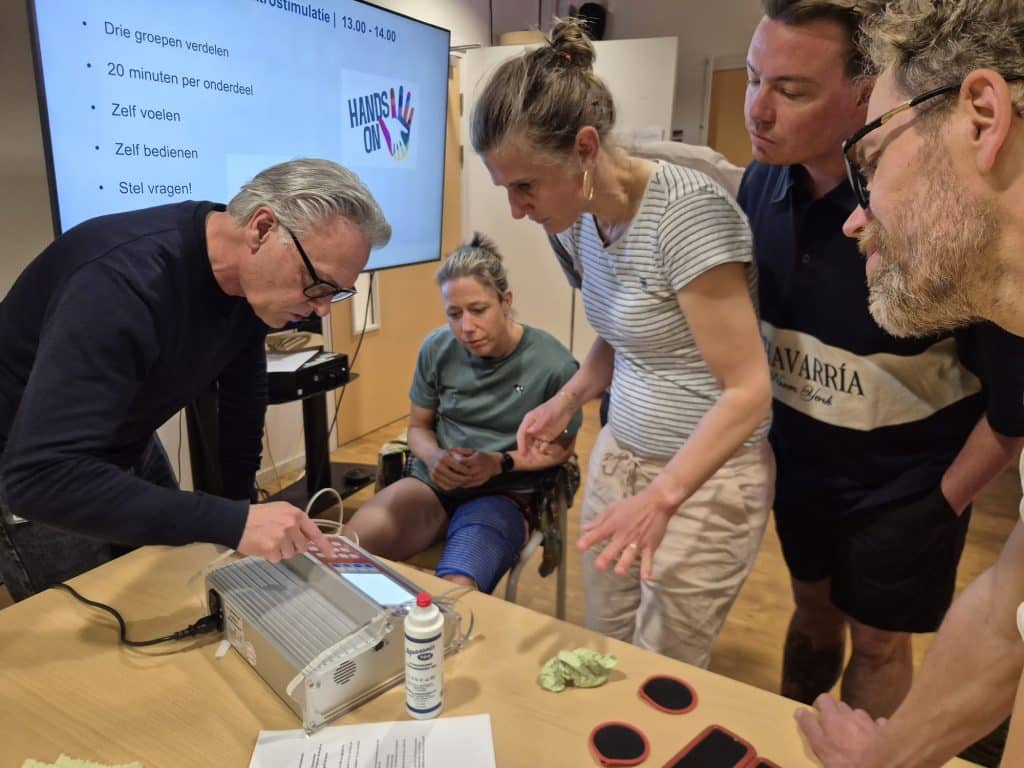 Dat elektrostimulatie makkelijk in gebruik is, werd direct duidelijk in de workshop. De moderne apparaten zijn handzaam, intuïtief en soms volledig voorgeprogrammeerd. Er kan eigenlijk niks mis gaan. De kosten variëren tussen de paar honderd euro (zoals Compex) tot richting de tienduizend euro (Rise, waarmee directe spierstimulatie bij mensen met een slappe verlamming mogelijk is). Bij sommige apparatuur (Stiwell Profes) moet de patiënt zelf de beweging initiëren (op geleide van een aanwijzing op het scherm van de bijgeleverde tablet) waarna via feedback van het EMG signaal elektrostimulatie de contractie verder versterkt. Op deze manier kunnen spieren in een functioneel patroon worden aangespannen.